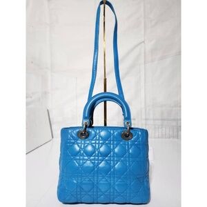Authentic CHRISTIAN DIOR Lambskin Cannage Medium Lady Dior Satchel Bag Blue