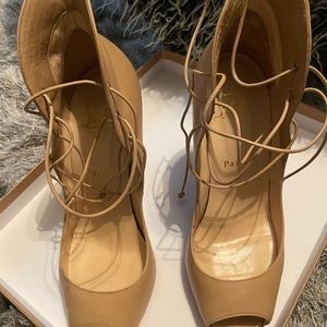 Iconic, chic, and sharp. These stunning Louboutins feature a sleek open-toe design with lace-up vamp detailing and a 4.25” stiletto heel that turns heads. Signature red soles, of course.