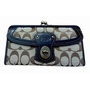 Coach, signature canvas, monogram wallet, brown and tan, leather trim, brass hardware, kiss lock, buckle accent, compact organizer, designer accessory, timeless style, durable material, everyday use, classic design, functional fashion, card holder, coin purse, luxury wallet, stylish organizer, premium craftsmanship, gift idea, authentic coach, versatile wallet, elegant accessory, collectible piece