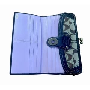 This Coach Signature Canvas Wallet features the iconic “C” monogram print in brown and tan with dark leather trim and brass hardware. The kiss-lock clasp and front buckle accent give it a classic, elegant design, while the multiple compartments inside provide practical organization for cards, cash, and coins.