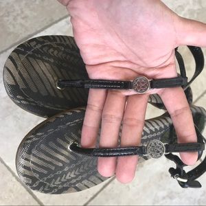 Authentic Coach 'Shirley' T strap thong sandal. Size 7. Good pre-loved condition. Bedding is canvas while strap is patent leather.