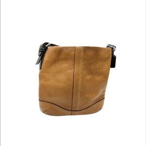Camel-colored shoulder bag by Coach, with dark brown shoulder strap, and off-white stitching throughout. In good condition