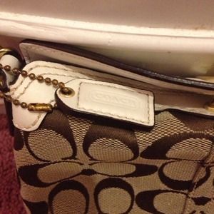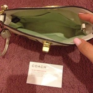 Fantastic authentic COACH wristlet in perfect condition. Outside has the classic "c" pattern with a white leather outline and a turnlock that opens into a light green inside.