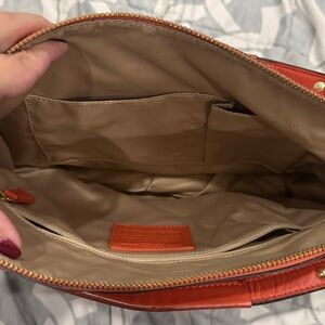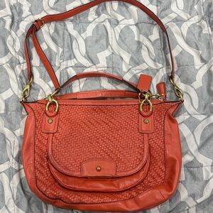 Chic red woven leather handbag with gold-tone hardware. Features a detachable strap and front pocket.