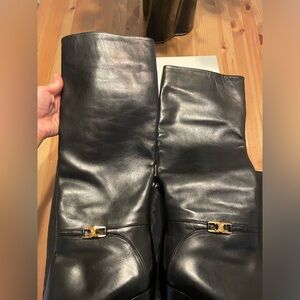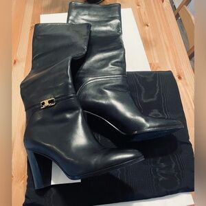 Authentic Celine Claude Knee High Leather Boots. Size 39 (US 9). Run a bit small and fit more like a US 8-8.5. 19.5" tall, heels measure 3.5". In very good condition. Minor scratches and natural creasing on the leather throughout. Wear on soles. Come with Celine care card, dust bag and box.