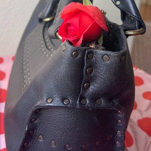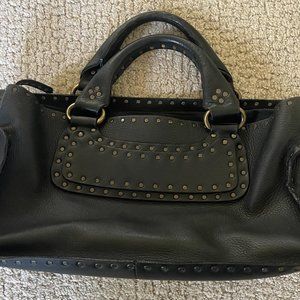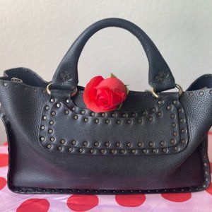 Crafted from authentic black leather with a middle zipper inside, this classic black handbag features metal stud accents, rolled leather top handles, and a signature CELINE engraved logo plaque proudly displayed on the side. The top of the bag opens to a smooth interior finely lined in a black textile fabric with a dividing middle zipper compartment and a patch pocket.