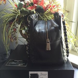 Chanel. Gorgeous Petit shopping. Black lamb. Silver hardware. Slight wear and tear on sides. Beautiful condition. Looks brand new. 10" W 7.5" H 4.5 D