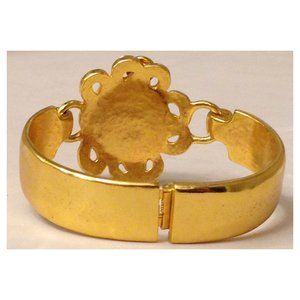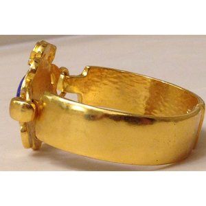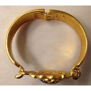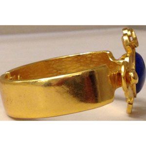 EXCELLENT CONDITION 97P Authentic Chanel CC LOGO Hinged Bangle Gold Tone Hammered Finish Metal Bracelet with Semiprecious Bright Blue Lapis Lazuli center.