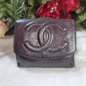 Authentic Chanel CC Caviar Leather Brown Wallet. This wallet is in great condition, the leather is buttery soft. There is so much hidden space. The front flap with the embossed CC is a snap close change pocket. The lining has a small hole where the snap has worm through the liner. The back side has 6 cards slots, a large bill slot and 2 slip pockets behind the card slots.