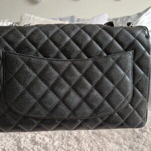 Selling an authentic Chanel Classic Caviar Jumbo Flap in Silver Hardware. This item was purchased at the Nordstrom Chanel Boutique in 2010. This bag is very spacious but still lightweight. The back of the bag and a small corner on the front flap had some color rub off (I think from brushing against my jeans), but the rest of the handbag is in great condition. You can bring the bag to Chanel to have them recolor it for a fee or to leather surgeons. Comes with the Chanel dust bag (there are two minor white stains on the dust bag). Dimensions 7.6 × 11.7 × 3.9 in. Comes from a smoke and pet free home. Free Poshmark authentication. This item retails for $11,700 before tax.