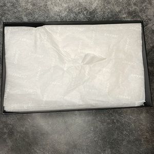 White lid, black base Chanel gift box with crinkle and tissue paper *tissue paper has been torn* Dimensions: L: 8.75” H: 4” W: 5.5”