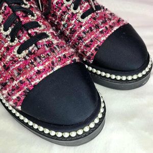 Authentic Chanel Lace Up Pink and Black Tweed Pearl "CC" Logo Platform Sneakers
