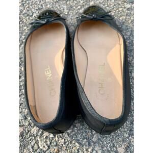 Keywords: Chanel, ballet, flats, black lambskin, leather, patent, cap-toe, classic, bow detail, double C logo, luxury, french, timeless, ballerina, ballerine