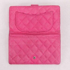 100% Authentic Chanel Wallet is crafted in a pink caviar soft leather with the classic Matelasse pattern, CC logo on the front snap closure and a patch pocket on the back. Opens to a matching pink leather and nylon interior, one large zippered compartment with two sections, zippered coin compartment, 3 slip pockets and and 8 card slots on each side. Silver tone hardware. A classic and perfect item for any occasion.
