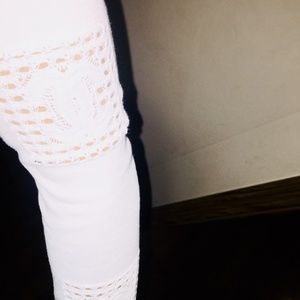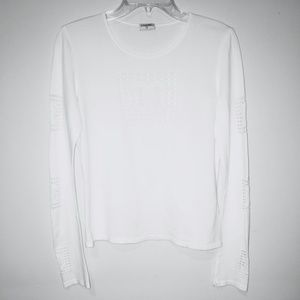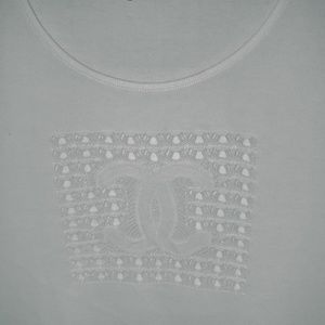 Beautiful authentic Chanel lightweight sweater in excellent used condition. Large crochet CC Chanel logos on chest and both sleeves.