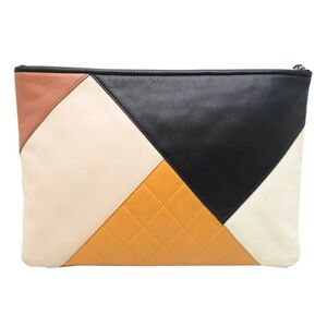 This Chanel O Case Clutch Colorblock Quilted Leather Medium, crafted from multicolor quilted leather, features a CC logo on the front and gold-tone hardware. Its zip closure opens to a black quilted nylon interior. Stains, dirt and marks on leather. 13" by 9". comes with authenticity seal.