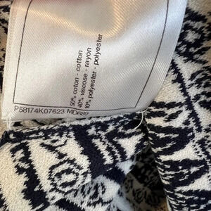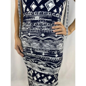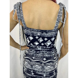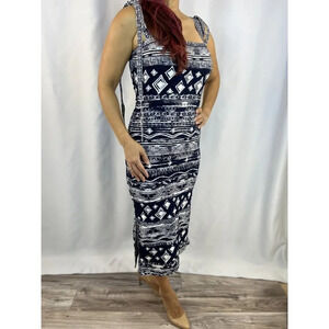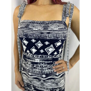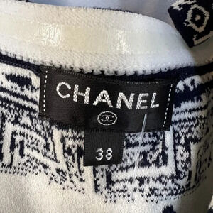 Authentic Chanel dress- Navy/white print on a beautiful soft stretch fabric and adorned with intricate detail and CC logo shoulder ribbons.