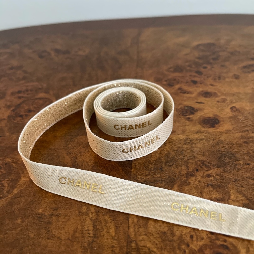 Stunning Limited Edition Holiday Authentic Chanel Ribbon. Soft velvety Shimmering gold inside , gold CHANEL logos outside. Approximate length 43”, approximate width 3/4”. Use it as a bracelet, a hair tie, use it instead of shoe laces, add it to your waist belt, wrap around Apple Watch band, or tie it on your bag handle! So many possibilities! 💕 💕NOTE: please make sure that listing length is enough for your project💕 please refer to pictures