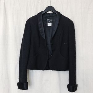 •Features: Black Tweed, Silk Lining and Collar, Chanel embellished Buttons, Structured fit, more of a cropped look. From 2006 Collection.