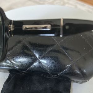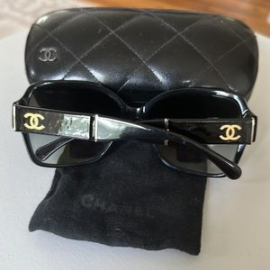 Authentic Chanel sunglasses Preloved ❤️ in excellent condition comes with linen soft case and hard case.Hard case has a little wear on inside rim cant be seen closed also back of hard case has a little wear from being set down. Black glasses black lenses cream large CC on sides and slight scratch on arm of glases near ear. See last pic for slight scratch