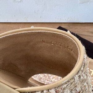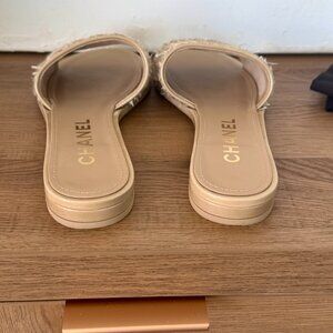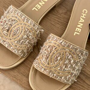 Authentic Chanel Tweed Slides Beige Gold CC Logo Sandals