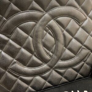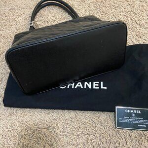 Elegant black quilted tote with iconic logo. Caviar leather Features sturdy handles and silver charm accent. Perfect for any occasion.includes authentic caviar wallet.