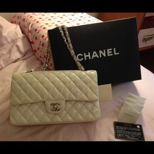 Authentic Chanel classic double flap in white/grey lambskin. It has been minimally used and the only wear visible are on the corners of bags (accurately depicted in the picture). The interior and exterior are pristine otherwise. Comes with original box, papers, and authenticity card. This is the medium/large double flap which measures 10x 6.5x 3