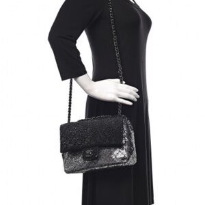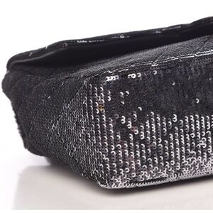 Authentic Medium sequin flap bag. This chic shoulder bag is crafted of silver and black circular sequins on a base of black fabric. The bag features dark silver leather threaded silver chain link shoulder straps with a silver Chanel CC turn lock on the front flap. This opens to a black satin fabric interior with zipper and patch pockets. This is a sensational shoulder bag for evening from Chanel! Only used once. Comes with authenticity card, dust bag and box. Full set!