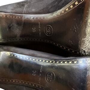 Authentic Chanel suede and patent leather platform pumps, US8 EU 38, 4” heel with ‘5 platform and signature Chanel with logo detail on sides. From 2011 collection with Chanel branded shoe bag, lots of life left in them but they are just a bit too big (I usually take US 7.5-8 and have a somewhat wide foot) but I needed 2 sided tape to keep them on reliably. Toe bed is rounded wider than most pumps, so if you have avg to narrow feet, they should fit you more comfortably than they do me. Suede is textured and there is a barely noticeable scuff on the left heel.