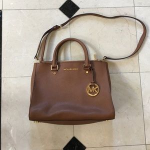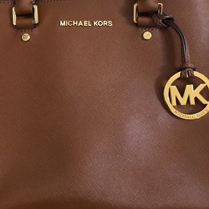 Perfectly neutral chestnut brown Michael Kors purse - like brand new! This purse has beautiful gold details with ample space in the main middle compartment and two zippered side compartments. Wear over the shoulder or remove the strap for a stylish handheld bag.