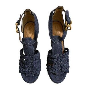 Authentic Chloe Blue Denim Wedge Espadrilles Sandals Size 39.5 (US 8.5)