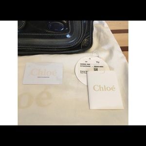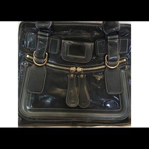 Chloe Patent Leather Large Dark Blue/Gray Bag. Double leather handles. Magnetic Closure with three compartments. Middle pocket has a full zipper closure and an additional zipper pocket. Gold Hardware. Dustbag, authenticity card and original retail tag included. This item is excluded from bundle order discounts. VGUC.