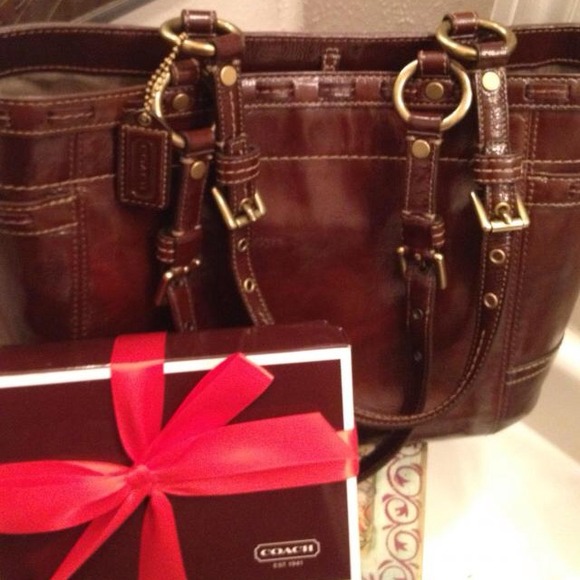 Choc Patent Leather, shiny, only used a few times, almost like new! This is a good deal! Don't pass this up, ladies. Inside lining is nice, outside leather is in excellent condition. Has golden brass hardware, mock belt buckle leather shoulder straps. Handbag is the stylish bucket design!!