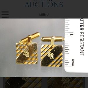 Stylish gold cufflinks featuring a unique logo and striped design. Ideal for formal events.