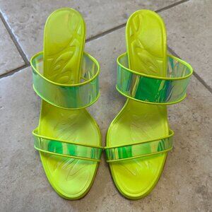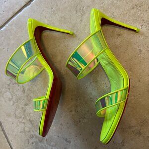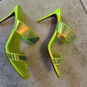 Christian Louboutin Just Loubi 85 Fluo Yellow Backless Sandal Mule Pump. Good condition. A small blemish on heel of one pump as shown in photos. Protection sticker on bottom. No box.