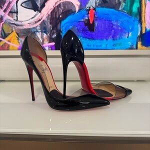 Elegant black patent leather stiletto heels with a signature red sole. Perfect for a night out. Never worn, new in box.