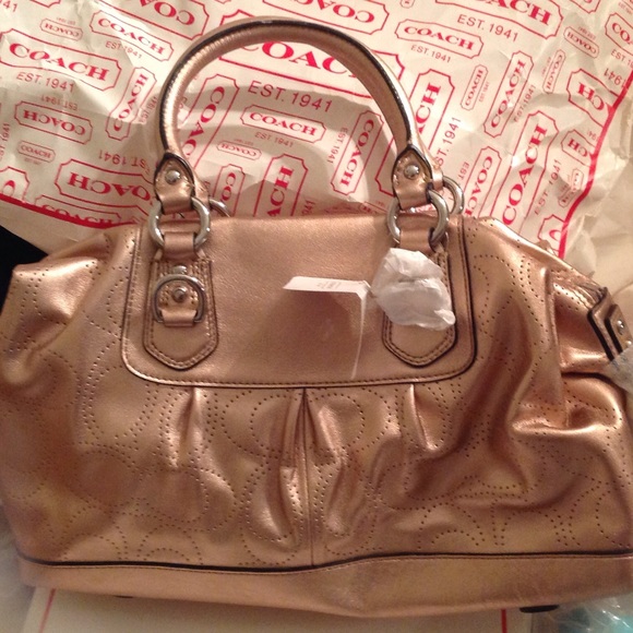 Brand new never used tags still attached gold Coach Perforated Leather Satchel. To handle straps with a 4" drop. 1 Coach leather hang tag. 1 interior zip pocket with leather Coach serial number plaque. 1 multipurpose slip interior pocket