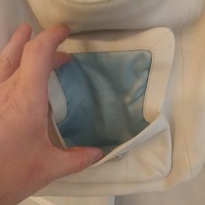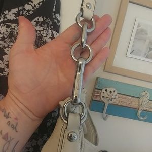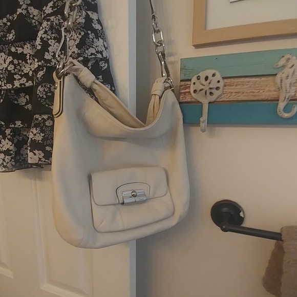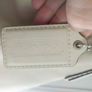 Never used ! Perfect condition, no marks inside or out . light blue silk lining , Eggshell color, medium size purse with beautiful silver hardware . shoulder strap is removable . hubby got as a gift few years back and I usually stick to my black oversized bags . Lowered price but firm on 40 for a be and new coach bag.