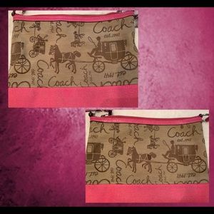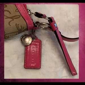 Signature Coach shoulder bag with traditional Horse & Carriage Print. Khaki color with a bright pop of pink! Authentic Coach~Creed # C1049-F15619. Features inside zip pocket & 2 inside slip pockets. Includes Coach hang tags. Shows only minor wear~please see pics & zoom in for precise details. Lots of life left in this beauty!