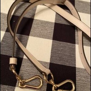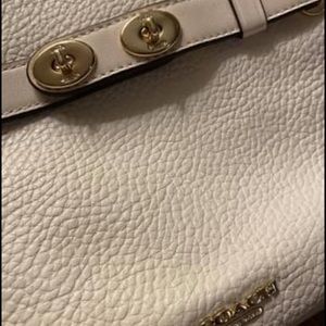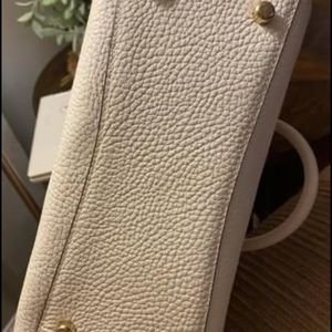 Excellent used condition. Can be worn as crossbody. Ivory color with gold tone hardware. Bag measures approximately 7” x 9” toward the base, approximately 7” x 11” towards the top.