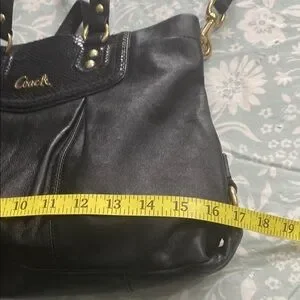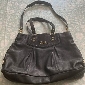 Excellent used condition clean inside and out! Black with gold accents, comes also with shoulder strap. This Coach black leather bag is perfect for any occasion. Its sleek design and high-quality craftsmanship make it a must-have accessory.