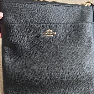 Authentic Coach Black Pebbled Leather Crossbody Bag with Gold zipper and accents. Front Pocket, inside pocket, adjustable crossbody strap. Length: 9", Width: 8". Excellent pre-owned condition.