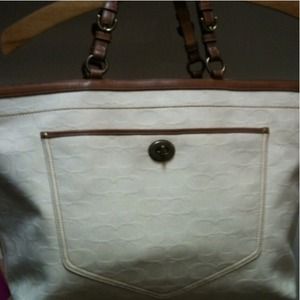 Authentic cream colored Coach carryall. It is detailed with a large outer pocket, large inner zipper pocket, as well as a cell phone and medium pocket organizer. The inside is the same color blue as the outer blue leather accent stripe on the front of the tote. The trim is brown and the accents are gold. The bottom of the tote is all leather and protected by four gold feet. Height: 12" Length: 14" Width: 5"