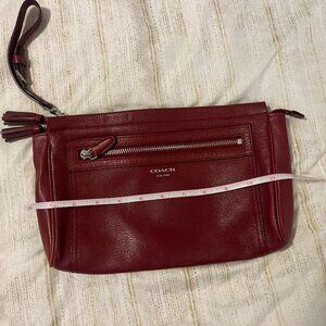 I am selling this clutch because I barely use it. It's a deep red or wine color and leather material. It has some marks in the inside but other than that it's in good conditions.