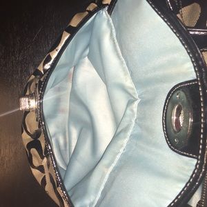 Gently used Coach diaper bag. With matching changing pad. Exterior is a coated material that is wipeable. Signs of wear to the silk like interior but not visible when items placed inside. Wear is photographed in the last photos. All zippers function and no rips or tears. Also including an ergonomic strap I purchased. This bag is still in very good condition and has years of life left!