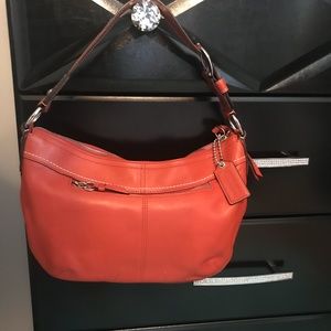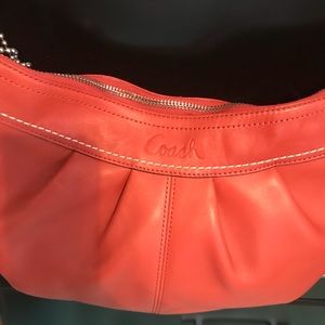 All leather Coach handbag. Tangerine in color. Not worn no scratches or tares.