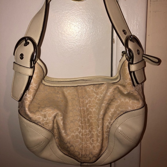 Cream colored COACH Handbag. Used but good condition. There are a few pen marks on it (see pics) and normal minor wear and tear. But very cute bag.