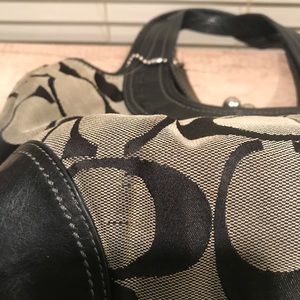 Black and gray signature Coach handbag with black leather trim and and 9” double leather straps. Lilac satin inside material with leather bottom and sides. Two separate compartments inside separated by a clasp closure compartment in middle. Lots of space! Zipper pocket on inside and 2 small open pockets. Lots of stains inside and significant wear on outside (see closeup pictures).