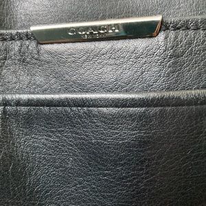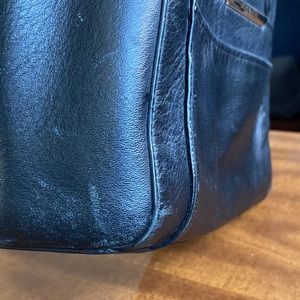 Good preloved condition. Black leather. Two front slip pockets, zip closure. 1 slip and 1 zippered internal pockets. Missing shoulder strap - price is reflective.