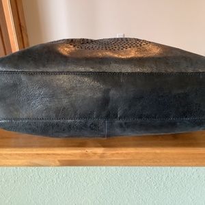 This is a beautiful black patent and dark gray and silvertone leather with a slight metallic sheen. The tote comes with two hangtags. The lining of the bag is a beautiful midnight blue. The bag features a zip top closure, inside zip pocket as well as additional interior pockets. The bag has a lasers Coach signature front. Approximate dimensions are 14” X 13” X 3”. Excellent condition.